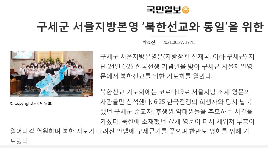구세군 서울지방본영은(지방장관 신재국, 이하 구세군) 지난 24일 6·25 한국전쟁 기념일을 맞아 구세군 서울제일영문에서 북한선교를 위한 기도회를 열었다. 북한선교 기도회에는 코로나19로 서