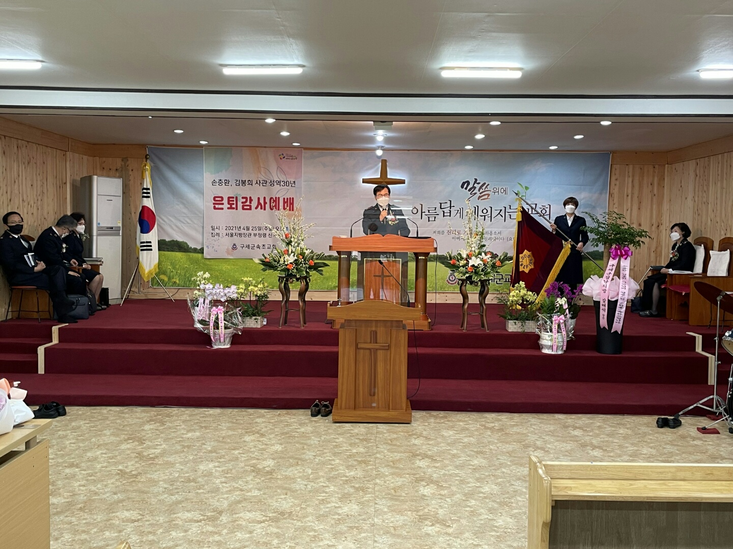 지난 4월 25일 속초영문에서 사역하셨던 손충환 김봉희 사관은 29년간의 사역을 은혜롭게 마치시고 신재국 장관의 인도로 은퇴감사예배를 드렸습니다. 코로나로 인해 많은 분들이 참석하진 못하였지만, 가족들과 가까운 지인들과 영문 군우들이 참석한 가운데 은혜롭고 풍성한 은퇴감사예배를 드렸습니다.